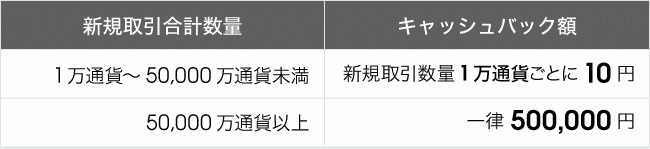・新規取引合計数量が5,000万通貨 ⇒ 50,000円キャッシュバック