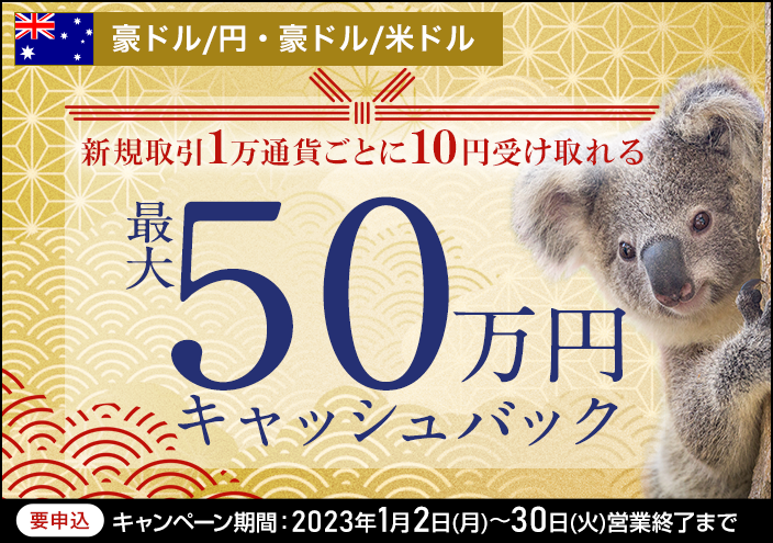 キャンペーンに申し込まれたお客さまに、期間中における豪ドル/円と豪ドル/米ドルの新規取引合計数量に応じて、最大500,000円をキャッシュバックします。