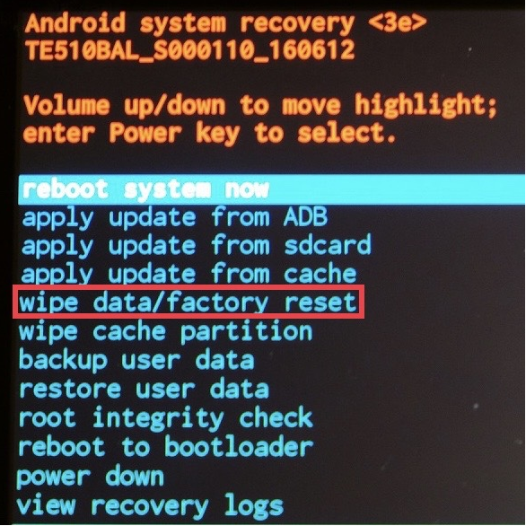 Step3:下記のような画面が表示されますので、音量調整ボタンを使って「wipe data/factory reset」を選択し、電源ボタンで決定します。続いて「factory reset」を選択して、電源ボタンで決定すると、AQUOSが工場出荷状態になり、パターンロックが解除されます。
