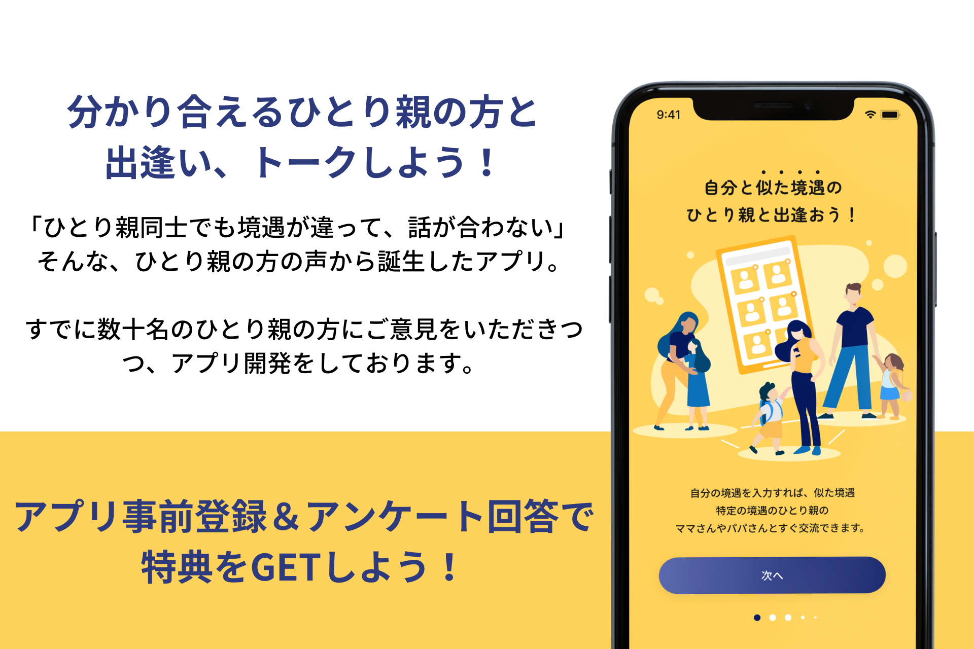 - “素晴らしいアプリだと思いました。フレンドマッチングをしながら、企業のシングルサポートしてくれる求人なども掲載していってほしい!また、私の知り合いの企業はひとり親家庭に毎月数万円サポートしていたり、習い事の費用を支払う事をしていたのでそういった事も情報提供できるのがいいなって思います。私自身シングルマザーで転職に苦戦していた時期があるのでそういった方のサポートができるサポーターになりたいと考えてます。”(シンママ)