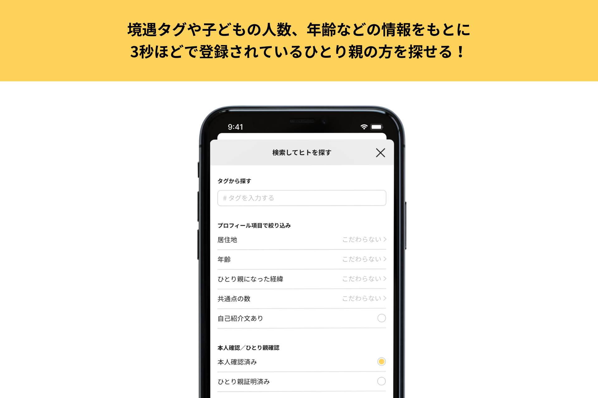 「死別でひとり親になって3年」「小学2年生の息子がADHD」「DV経験者」「娘の生理について相談したい」といった、境遇や相談してみたいことなどのタグを自由に入力することで、より境遇やトークしたいことが近いひとり親の方とすぐに出逢える機能です。