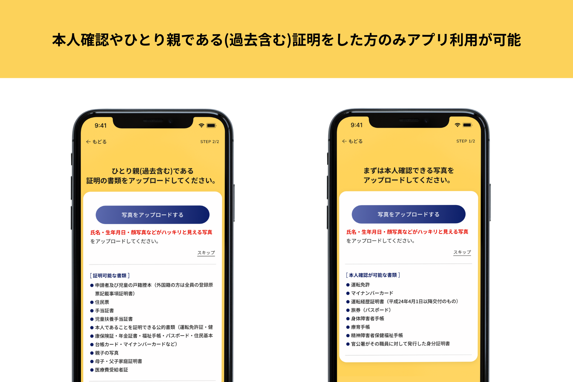 ご登録された方にお手数をおかけしますが、本人確認とひとり親である(過去)証明をされた方のみアプリのすべての機能の利用が可能です。