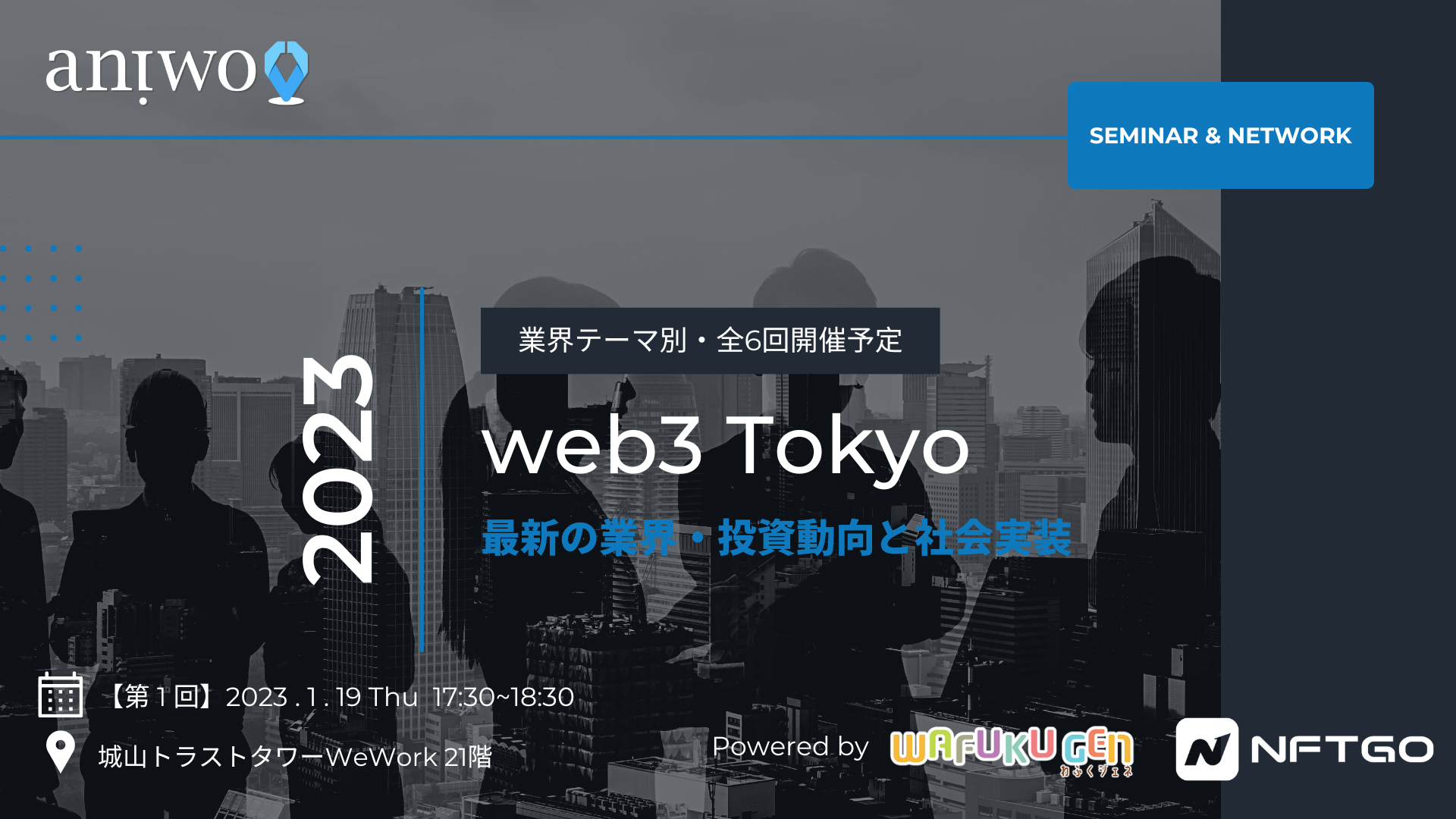 この度Aniwoは、国内トップクラスのNFTコミュニティを運営する「WAFUKU GEN」と世界で100万人以上のユーザーへNFTプラットフォームを提供する「NFTGo」協力のもと、web3に特化したセミナー&ネットワーキングイベント『web3 Tokyo』を開催し、事業領域別にweb3業界の最新情報・社会実装の事例を、毎月ご紹介します。
