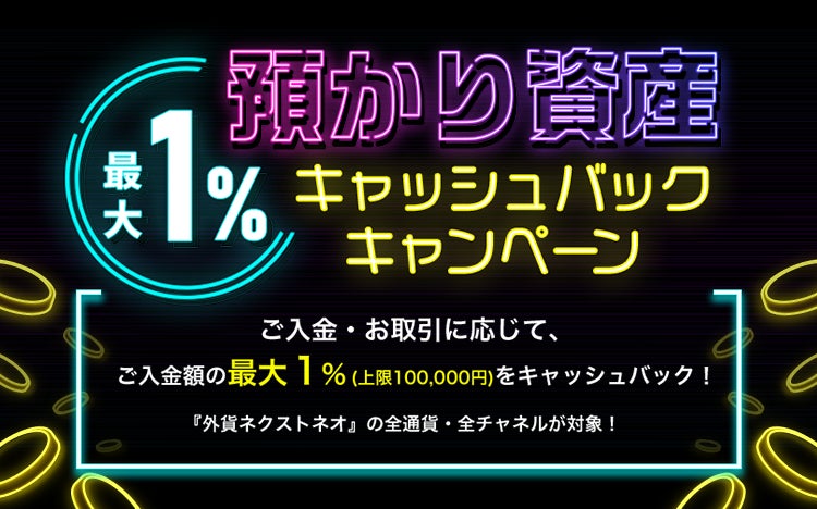 対象期間中の『外貨ネクストネオ』における入金額および新規注文の取引量に応じて、ご入金額の最大1%の金額をキャッシュバックいたします。