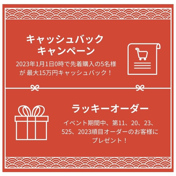 - 2023年1月1日0時で先着購入の10名様が最大15万円キャッシュバック。