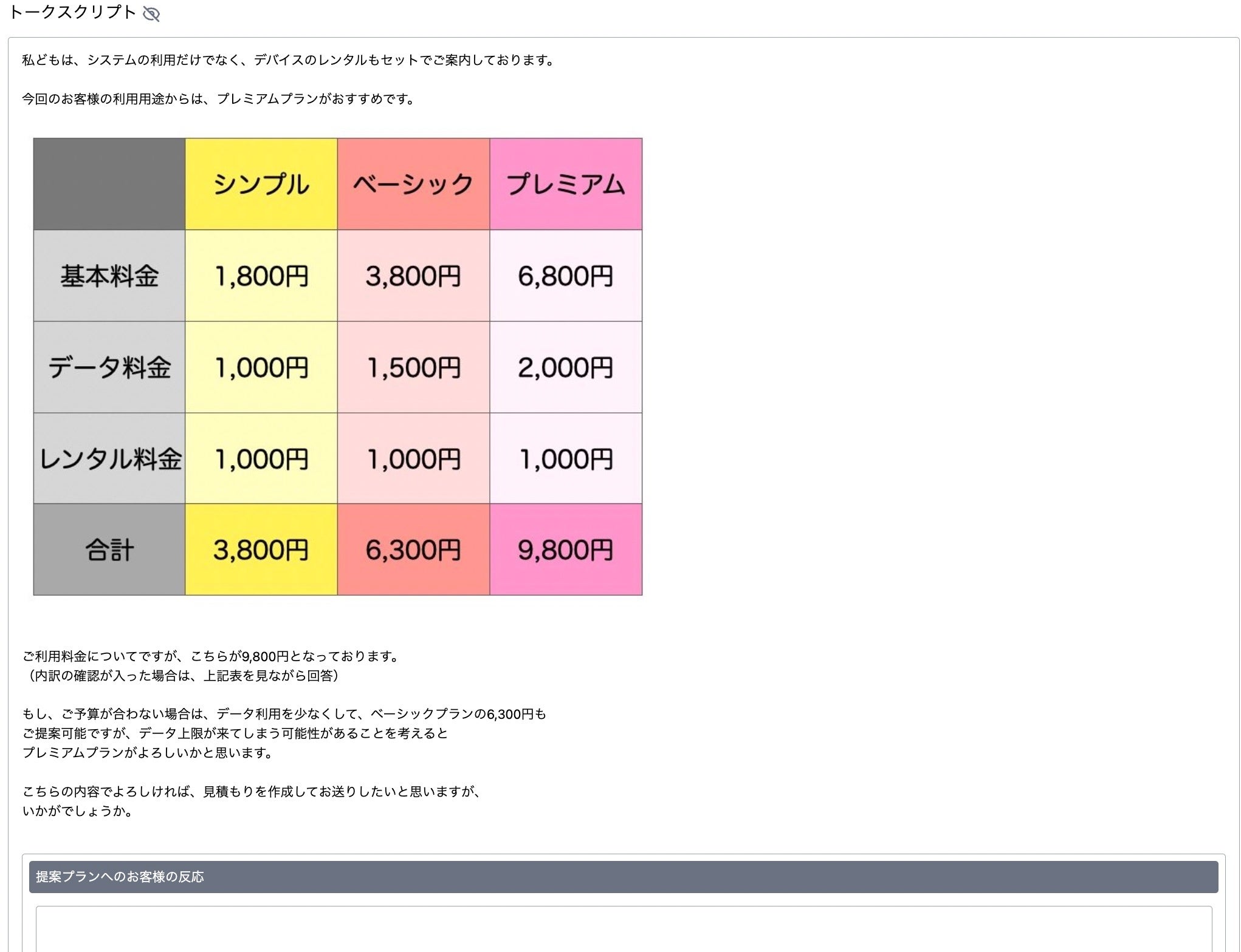 料金プランなどの表を活用することで、文章よりも、視認性が向上して、見ながら返答をしやすくなります。
