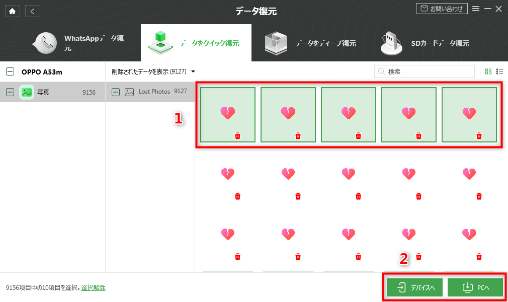 4.Androidから削除された写真や既存の写真を一覧表示します。復元したい画像を選択して、右下の保存先を選択します。