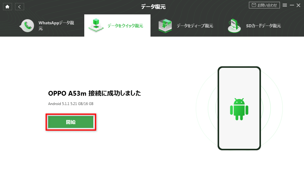 3.USB経由でAndroidデバイスをパソコンに接続して、DroidKitがAndroidスマホを認証したら、「開始」をクリックしてください。