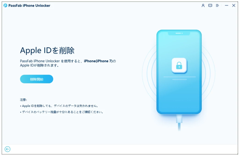 Step1:PassFab iPhone Unlockをパソコンにダウンロードして起動し、「Apple IDを削除」をクリックします。