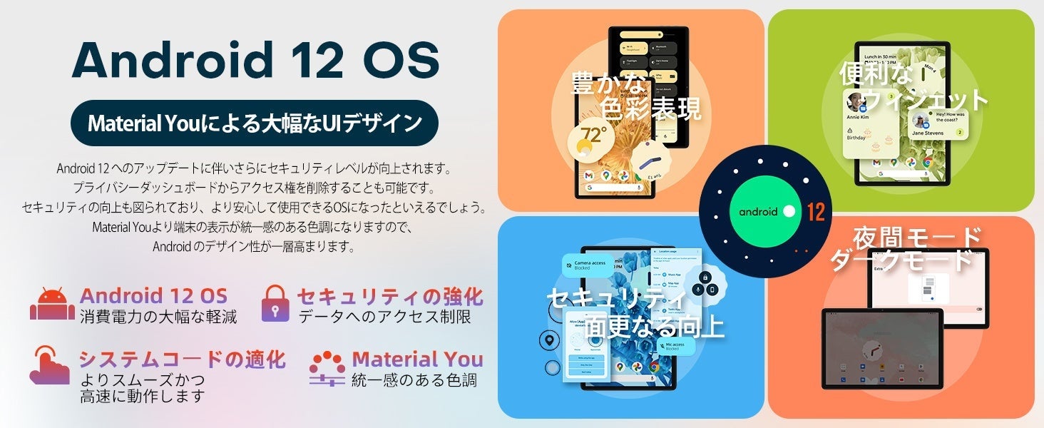 Android 12を搭載して、よりパーソナライズで安全かつ簡易なシステムエクスペリエンスを提供します。ユーザーはUIの配色やウィジェットなどを自由にカスタマイズすることができるだけでなく、クリックやスワイプ、スクロールもよりスムーズに行えるようになります。
