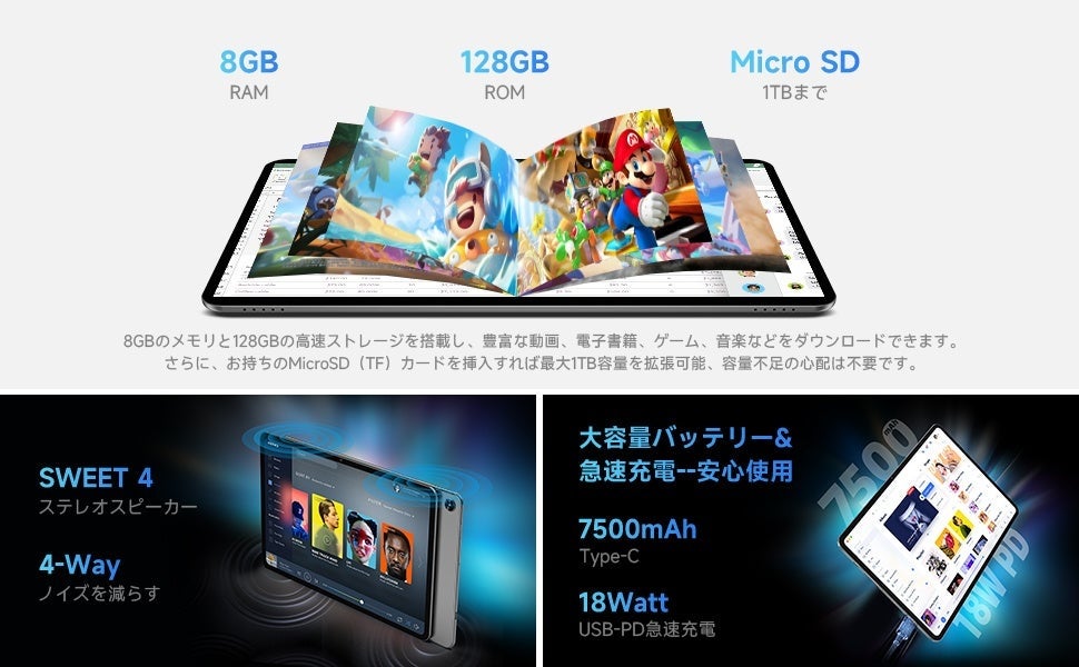 7000mAhのバッテリーが搭載されています。 18W USB-PD急速充電をサポートしているため、大体4時間で満充電になる可能です。ゲームが必要なときにタブレットをすぐにフルに戻すことができます。より長い待機時間を提供できます。Teclastは、子供がタブレットの利用時間の長さおよびアプリの選択など、保護者の方々が悩んでいる問題点に対し、新しい子供の見守りアプリを開発しました。より効果的に管理することができ、タブレットに学習と娯楽のより良いバランスを持たせます。