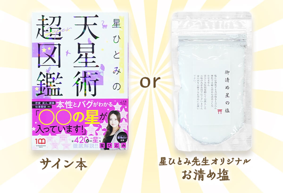 星ひとみのオリジナルグッズが当たるかも!? 星ひとみのサイン入り書籍(星ひとみの天星術超図鑑)、またはお清め塩を合計で20名様にプレゼントします。