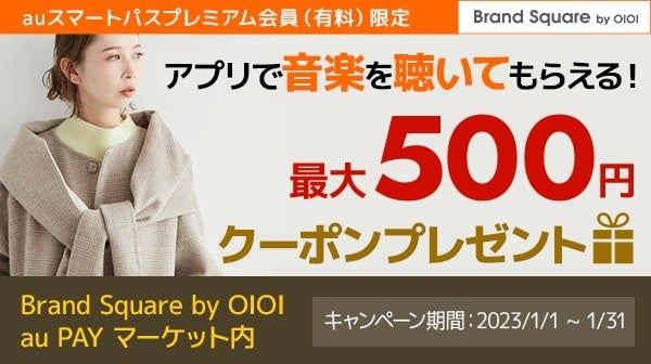 - 概要:auうたパスアプリで指定の音楽プレイリストを聴いていただいたauスマートパスプレミアム会員、auうたパス会員に、au PAY マーケット内のBrand Square by OIOIでご使用いただける最大500円分のクーポンをプレゼントします。