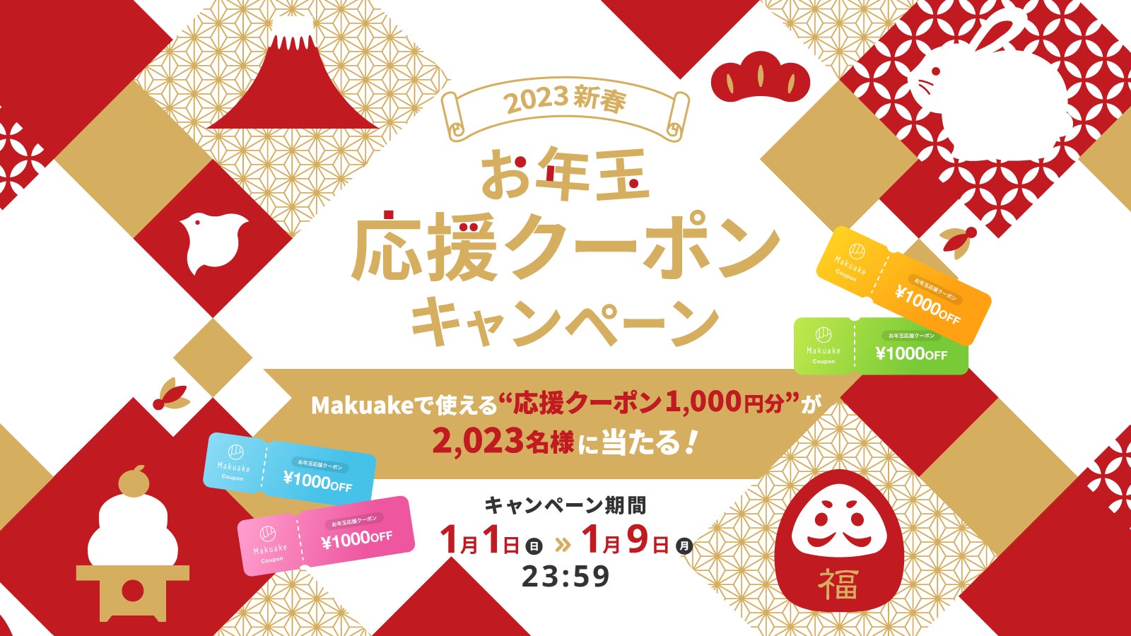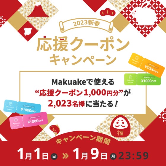 本キャンペーンは、2023年1月1日(日)〜2023年1月9日(月)の期間中に「Makuake」で7,000円(税込)以上の応援購入をし、キャンペーンに申し込んでいただいたサポーターを対象に、抽選で2,023名に1,000円分の応援クーポンが当たる、新年特別企画です。