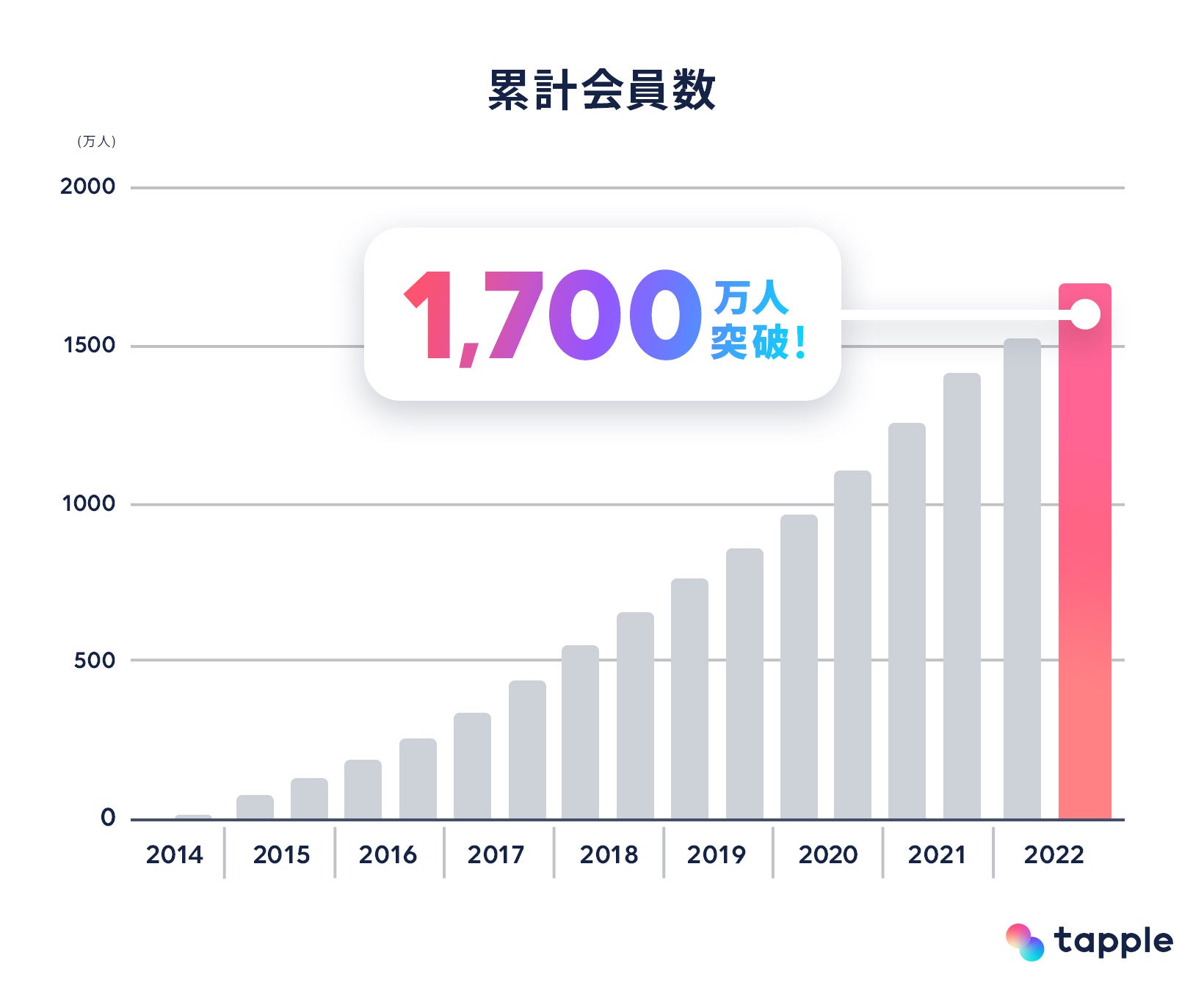 「タップル」はグルメや映画、スポーツなどの共通の趣味をきっかけに恋の相手を探せる国内最大規模のマッチングアプリです。2014年5月のサービス開始から8周年を迎え、累計会員数は1,700万人(※1)、「タップル」を通して累計5億組のマッチングが成立(※2)しています。
