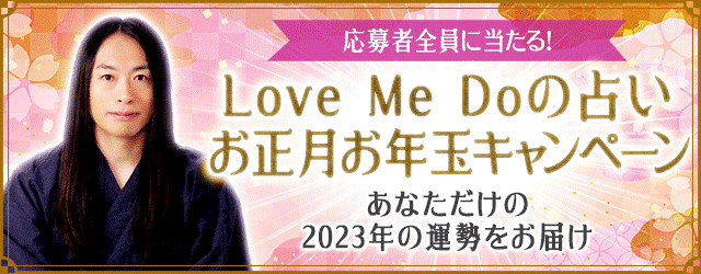 有名芸能人の結婚やスキャンダルから自然災害、政治・経済まで様々なニュースを的中させる『予言的中の占い師』Love Me Do。現在、月額公式サイト『ラブちゃん占い』にて、『Love Me Doの占い お正月お年玉キャンペーン』を開催中です。