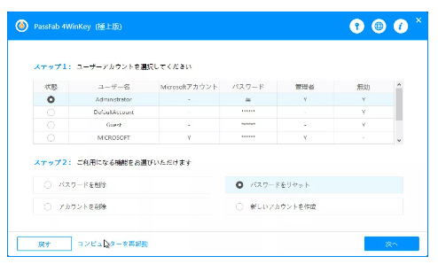 Step6:ロックされているアカウントを選択し、「パスワードの削除」にチェックを入れ、「次へ」へ進みます。