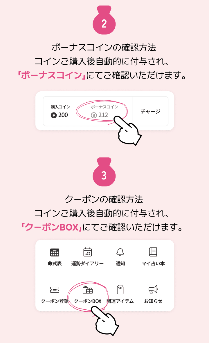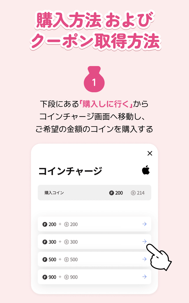 コインを購入すると、特典(ボーナスコイン・クーポン)は自動で付与されます。