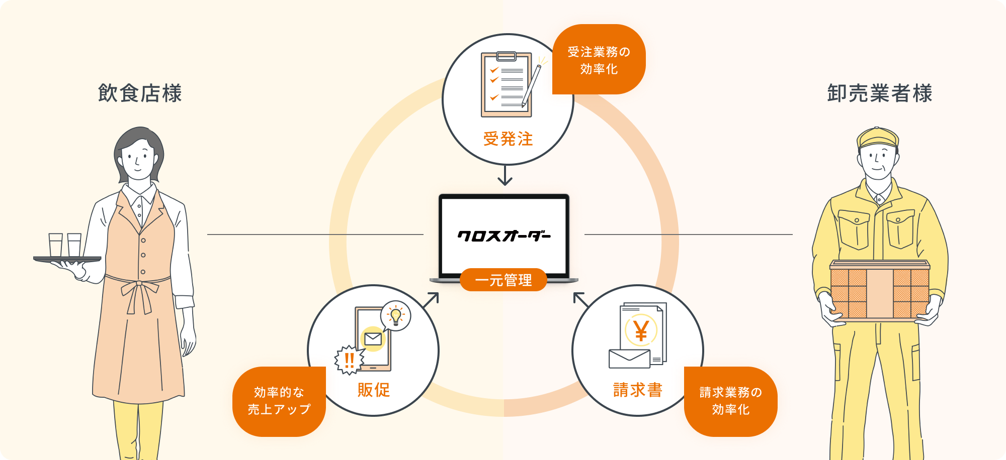 当社は飲食店様と卸売業者様をつなぐプラットフォーム「クロスオーダー」を提供しています。FAXや電話が主流だった受発注業務をスマートフォン上のLINEに切り替え業務効率化を推進する「クロスオーダー受発注」を皮切りに、LINEを活用したオンライン販促機能「クロスオーダー販促」、電帳法に対応した請求書DX機能「クロスオーダー請求書」など、飲食店様と卸売業者様のあいだのアナログな業務をデジタル化すべく、さまざまな機能を展開してまいりました。