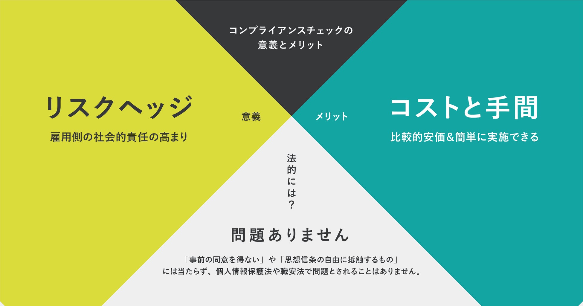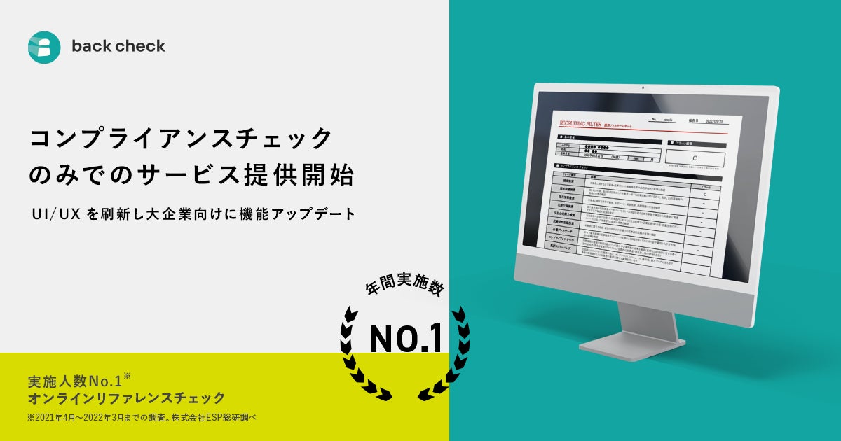 back checkでは2021年8月より、従来のリファレンスチェックサービスにオプション機能として新たに加える形で、反社会的勢力との関与や犯罪歴の有無などの基本的なコンプライアンスチェックを提供してきました。その後、2022年4月にはクレジットチェックやSNS行動歴なども含める形で機能を拡張。このたび、大企業の皆さまを中心にお寄せいただいてきた、コンプライアンスチェック機能単独での導入・活用の要望にお応えする形で機能アップデートを行い、新たに単独プランとして本格的に提供開始する運びとなりました。