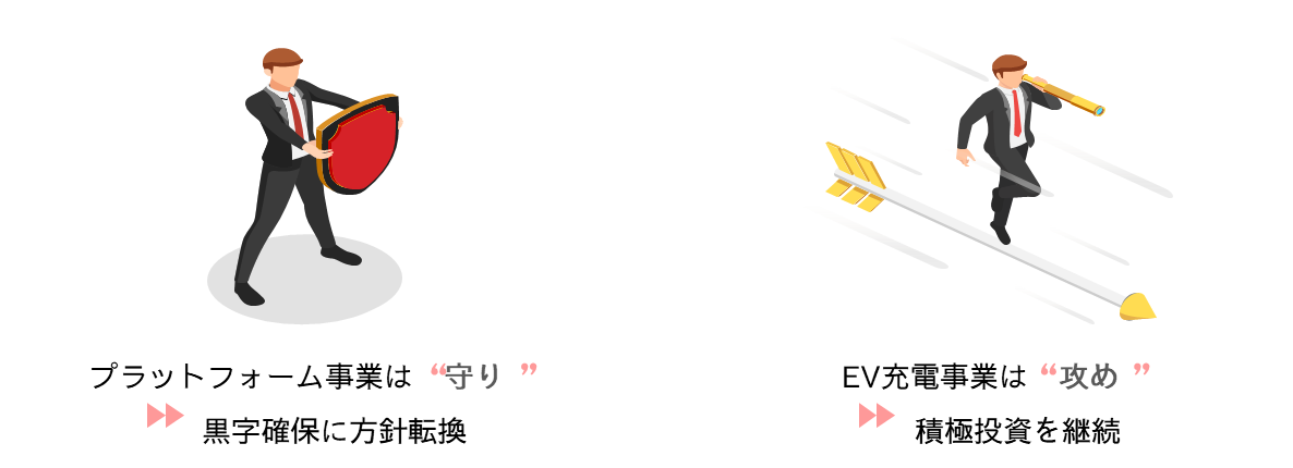 急激な市場環境変化を受け、プラットフォーム事業では守りを固め利益確保をする一方で、EV充電事業へ補助金活用による積極投資の継続など、「守りながら攻める」経営に機動的に転換することができました。