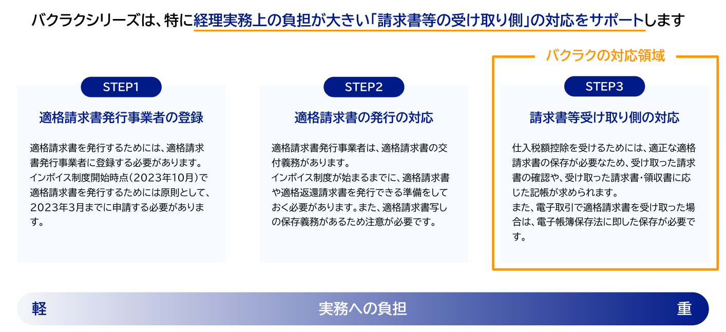 インボイス制度においては、適格請求書の交付だけでなく、受け取った請求書等の処理に対する対応が求められていますが、請求書や領収書は多様な様式で受領するケースが多く確認項目も多いことから、請求書等受け取り側の対応の方が業務負荷が大きいと言われています。