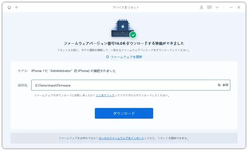3、最新版のiOSファームウェアが自動的に検出されるので「ダウンロード」をクリックします。
