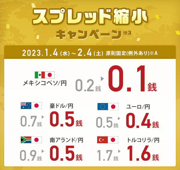 ※3 「提示時間帯拡大!スプレッド縮小キャンペーン」スプレッド(対象期間:2023年1月4日(水)午前9時00分~2023年2月4日(土)午前3時00分、提示時間帯:対象期間中の各営業日午前9時~翌午前3時)