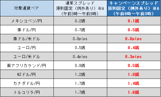 ※キャンペーンスプレッドの提示時間帯はすべて対象期間中の各営業日の午前9時~翌午前3時。同期間中の通常スプレッドは各営業日の午前3時~午前9時に提示。