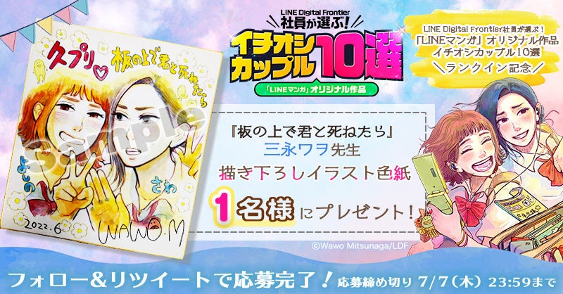 さらに、この度の発表を記念したTwitterキャンペーンも開催します。LINEマンガ編集部公式Twitterアカウント(https://twitter.com/LINEmanga_edit)をフォローし、対象の投稿をリツイートした方のなかから抽選で、mako先生直筆サイン入り『営業スマイル男女』コミックス第1巻を1名様に、『板の上で君と死ねたら』三永ワヲ先生描き下ろしイラスト色紙を1名様に、『まぁるい彼女と残念な彼氏』丘邑やち代先生描き下ろしイラスト色紙を1名様にプレゼントします。