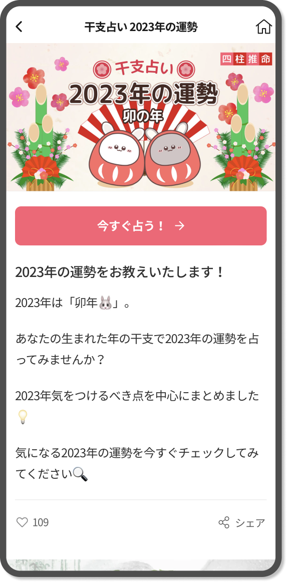 下記リンクからフォーステラーの干支占いを行うと「2023年開運おみくじ」の無料利用券がゲットできます!