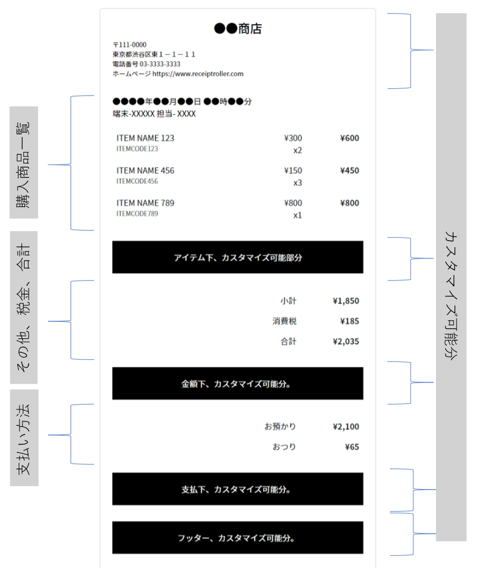 電子レシートには5カ所カスタマイズ可能な箇所があります。