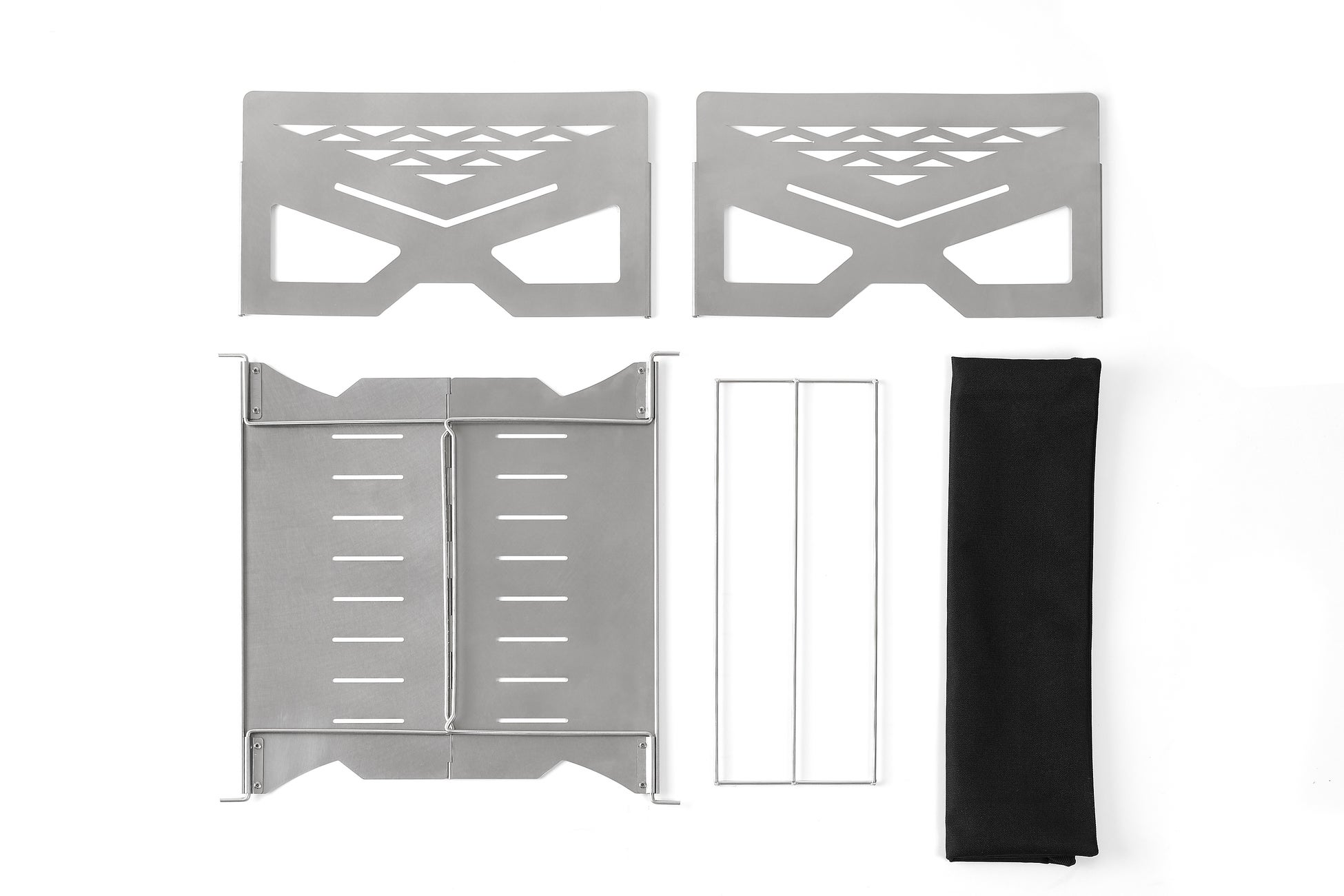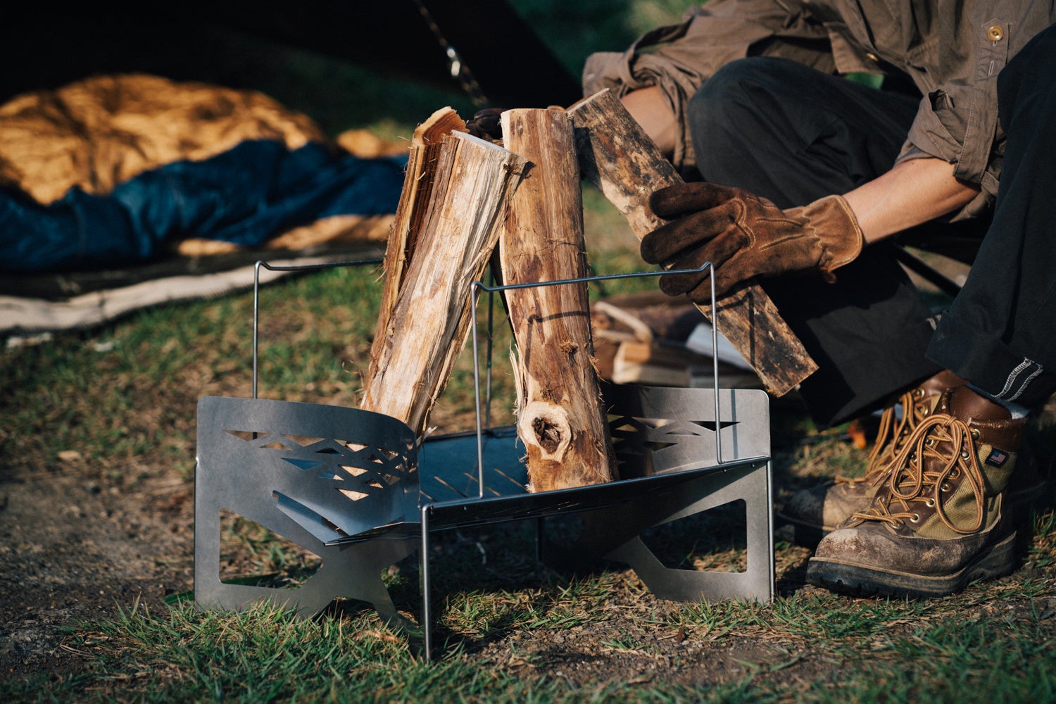 従来の軽量焚火台に比べ、薪をストレスなく組めるよう火床の広さを十分に確保。より燃焼効率が高まる「井桁型(いげたがた)」や美しい炎が鑑賞できる「合掌型(がっしょうがた)」など、自由な組み方が楽しむことが可能。 薪を支える火床には3つの梁があり、脚となるパーツを垂直荷重でしっかり支えるので、安定感も抜群です。