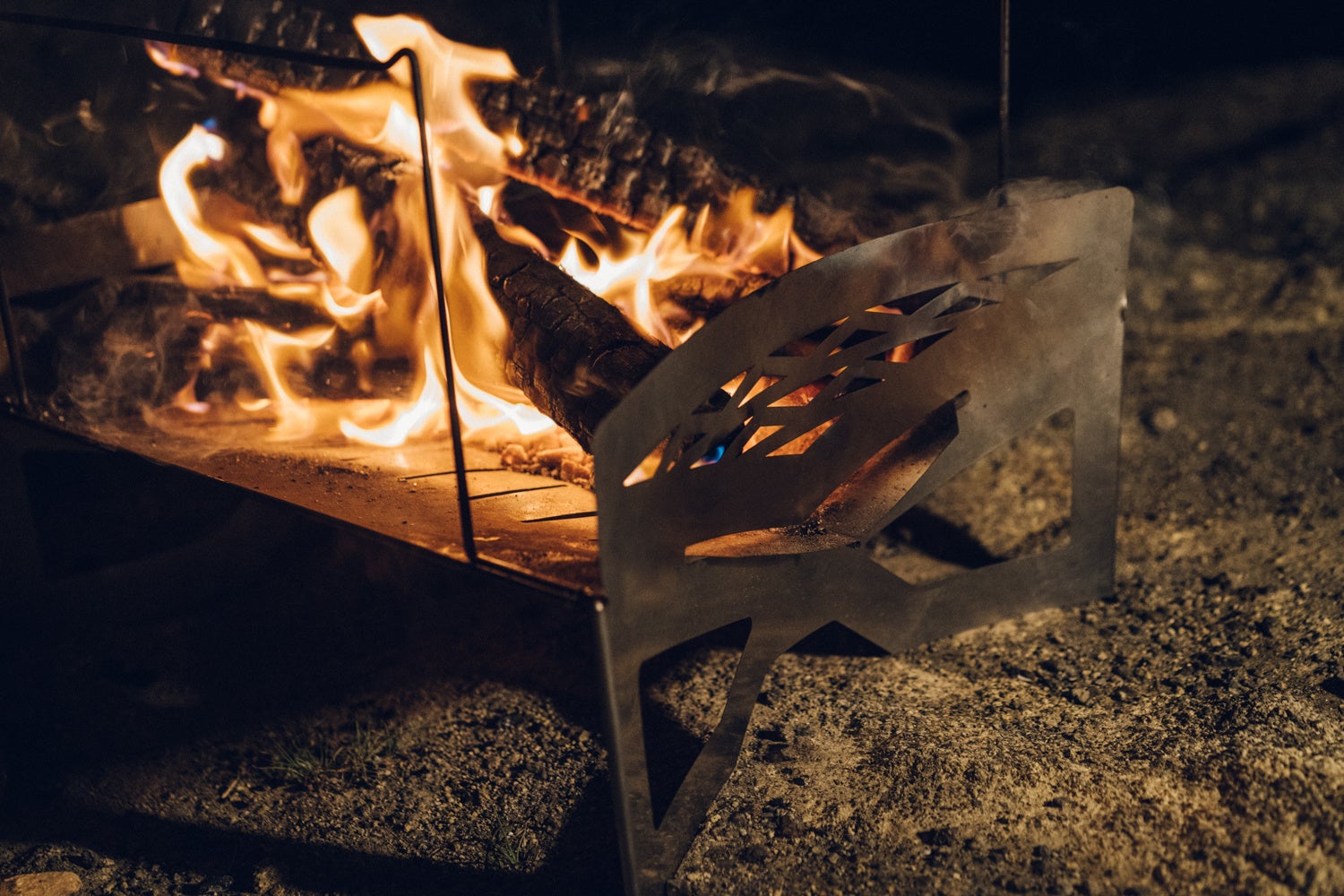付属のゴトクを使用すれば、ケトルでお湯を沸かしたり、直火による調理が楽しめる。スタンドと側面のパネルの両方に設置できる2WAY仕様となっており、火床の距離を変えることで火力を調節可能。