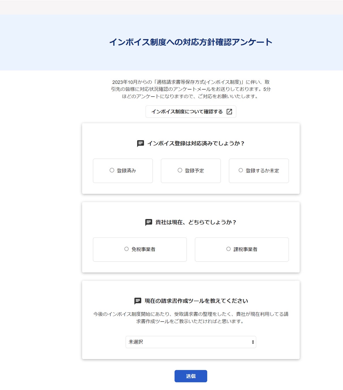 取引先のインボイス制度登録状況を確認する為のアンケート機能を無料で使えるのは国内初です。(※2)