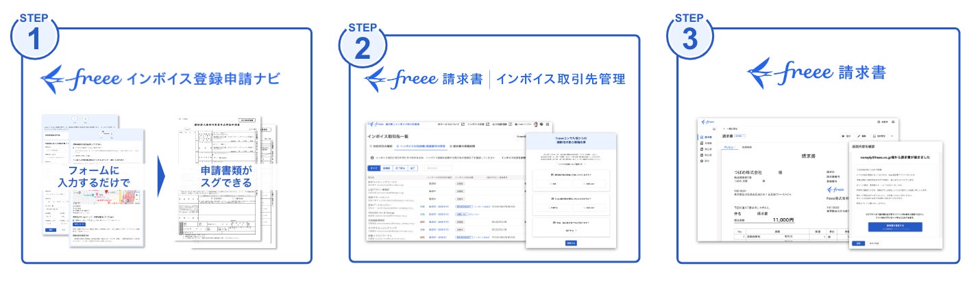 freeeは既に、インボイス制度対応において事業者が対応するべき、事業者登録申請・取引先の登録申請・適格請求書の作成において「freeeインボイス登録申請ナビ」「freee請求書/インボイス取引先管理(※1)」「freee請求書」の3つのサービスを「インボイス無料3STEP」として昨年12月13日提供開始しました。