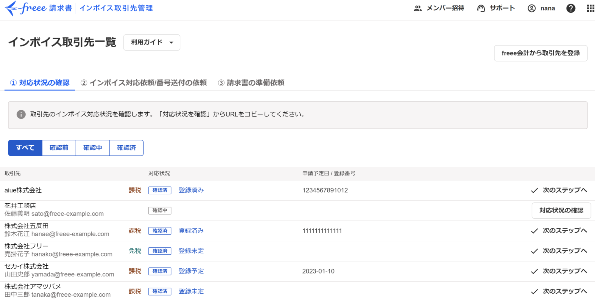 買い手側が、インボイス対応依頼から登録状況の確認までの管理を「freee請求書/インボイス取引先管理」で行うことで取引先の対応状況を一元管理することができます。