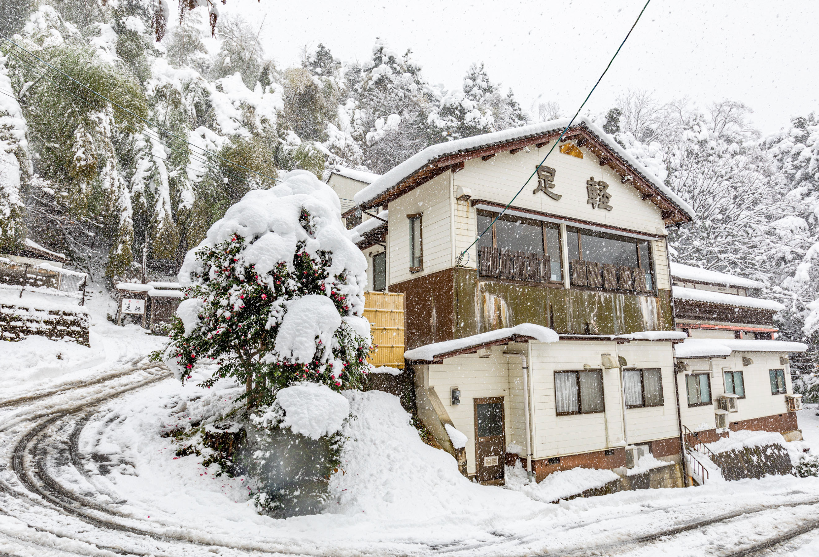 JR城崎温泉駅から県道9号を車で2〜3分。温泉街から少し離れた静かな山の中に「山荘足軽旅館」はあります。昔ながらの日本らしい2階建ての建物で、客室は和室が6部屋。1日に15人ほどのお客さまを迎え入れることができます。