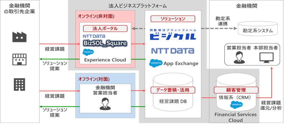 具体的には、三菱UFJ銀行がこれまで培ってきた対面・非対面チャネル運営のノウハウを基に、BusinessTechの非金融領域における問題解決プラットフォーム「ビジクル」と、インターネットバンキングや多種多様なソリューションとの連携が可能なNTTデータの法人向けポータルサービス「BizSOL_Square」、Salesforceが提供する「Salesforce Financial Services Cloud」などの顧客関係管理(CRM)システムを連携して提供いたします。これらを組み合わせることで、プラットフォーム上の様々なデータの一元管理やデータ分析に基づく提案の高度化、オンライン・オフライン両面でのシームレスな情報提供など、新たな顧客体験を実現いたします。