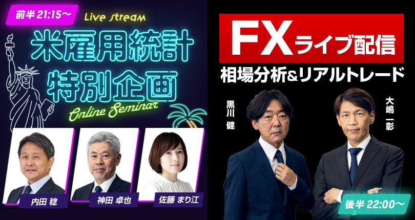 外為どっとコムでは、為替業界のみならず全てのマーケット関係者が注目する経済指標「米国雇用統計」を解説するオンラインセミナー、またリアルトレードを配信いたします。