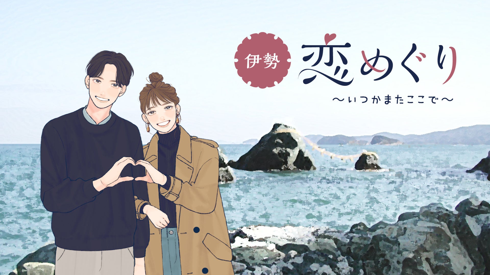 伊勢恋めぐり~いつかまたここで~は、外宮周辺、内宮周辺、二見浦を周遊しながら一つの恋愛ストーリーを完結させるイベントで、古くから夫婦円満や縁結びなど縁と縁を結ぶ象徴の夫婦岩がある二見浦がゴールとなっています。何故、二見浦がゴールなのか、結末はどうなるのか、伊勢市が紡ぐ2人の恋愛ストーリーをお楽しみください。また、サブエリアの2カ所ではスピンオフ作品が掲載されます。メインストーリーとはまた異なるもう一つのお話を是非ご覧ください。