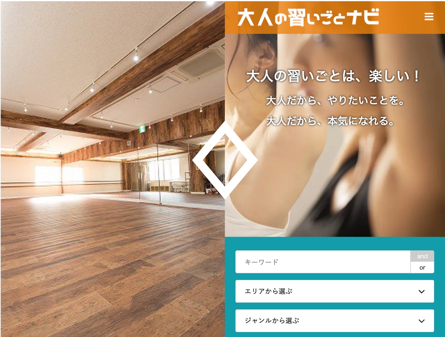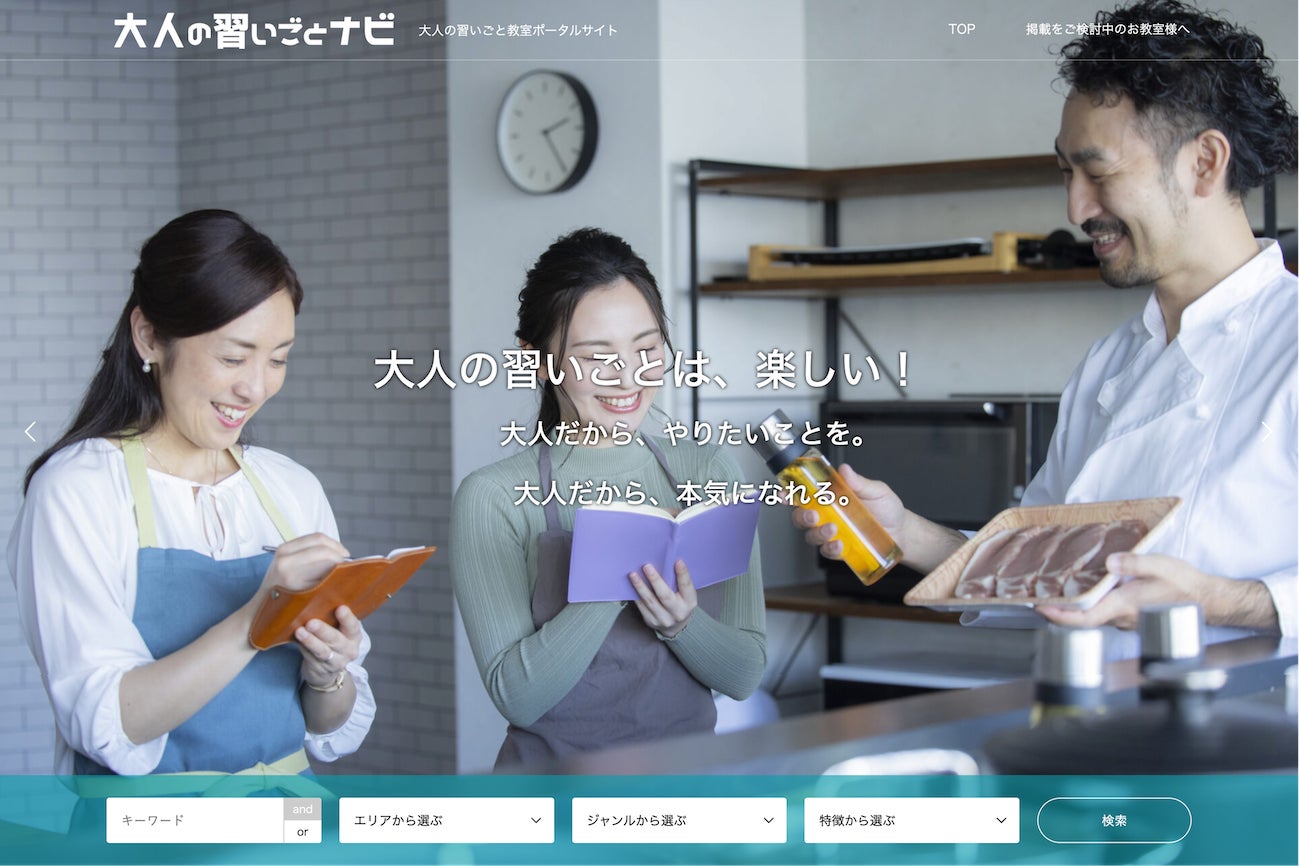 が運営する「大人の習いごとナビ」は、その名の通り”東京の“、”大人向けの“、”習いごと教室“を掲載する無料のポータルサイトです。
