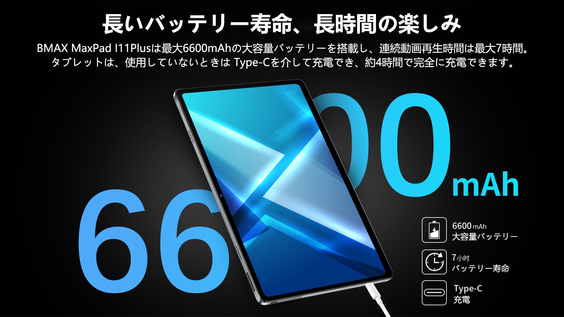 【8GBのランニングメモリと128GBの高速ストレージを搭載】ストレージに拡張可能なMicroSDをサポートしています。メモリ容量が大きいとタブレットはサクサク動くようになります。Webサイトや動画を見たり、重いアプリや高画質のゲームを楽しみいただきます。お気に入りの本、曲、写真、映画、ゲームなど、好きなものをすべてダウンロードして保存できます。容量不足に困ることなく十分にお楽しみいただきます。6600mAhの大容量バッテリーとAIインテリジェント電源管理により、7時間の映画・読書・ブラウジングを楽しむことができます。