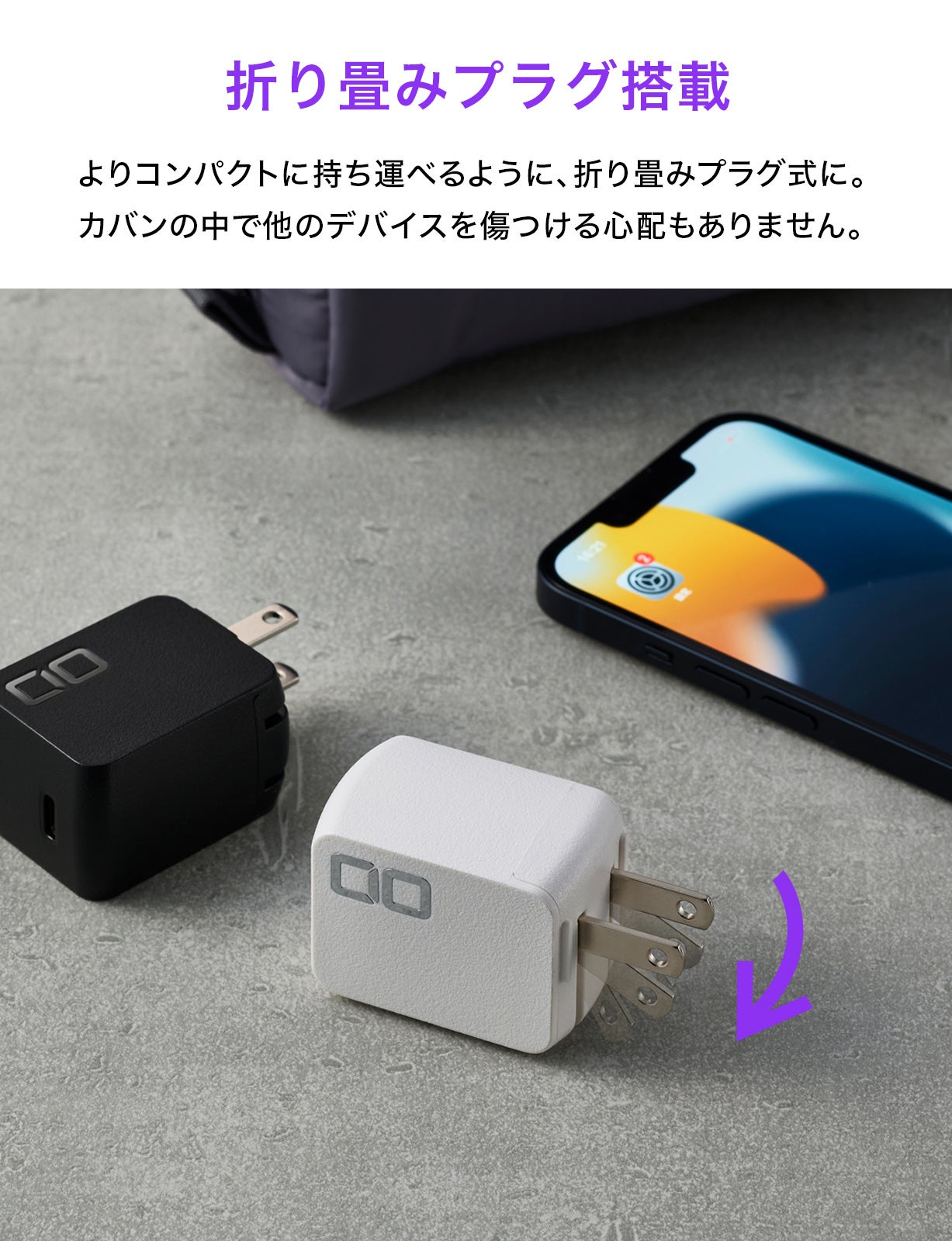 GaNテクノロジーを採用し極限まで小型化しつつ発熱を抑えることが可能になりました。コンセント使用時も他の充電器との干渉を少なく設計しています。