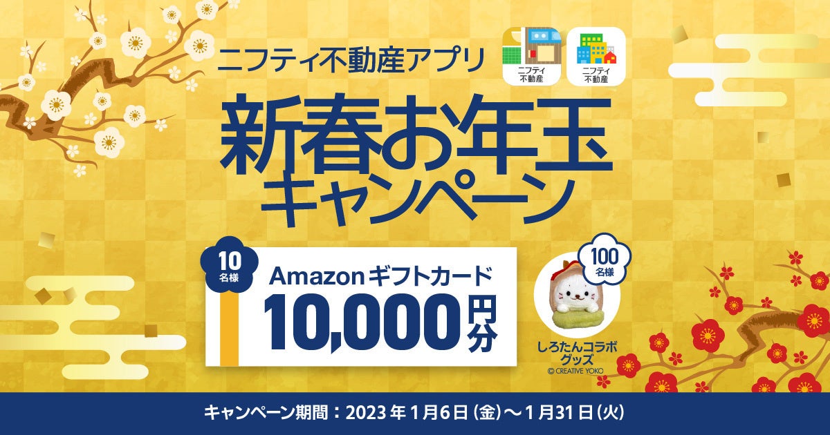 ニフティ不動産は、春の引越しシーズンを控え「手間なく簡単に、理想のお部屋探しをしたい」というみなさまを応援する気持ちを込めて、このたび新春お年玉キャンペーンを実施いたします。この機会に是非、便利なニフティ不動産アプリをご利用ください。