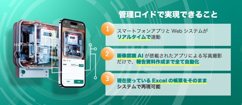 「管理ロイド」はAIを活用した不動産管理業務の業務効率化を目的としたSaaS型ソフトウェアです。建物管理の計画、検針・点検・清掃・警備等の実務の効率化、履行管理、不具合報告、報告書自動作成機能等、不動産管理業務に必要な機能が搭載されております。様々な機能を持つ中で、特に「既存フォーマットに対応した帳票自動作成」及び「AIによるメーター読み取り自動化」の機能が評価され、ご導入頂いております。