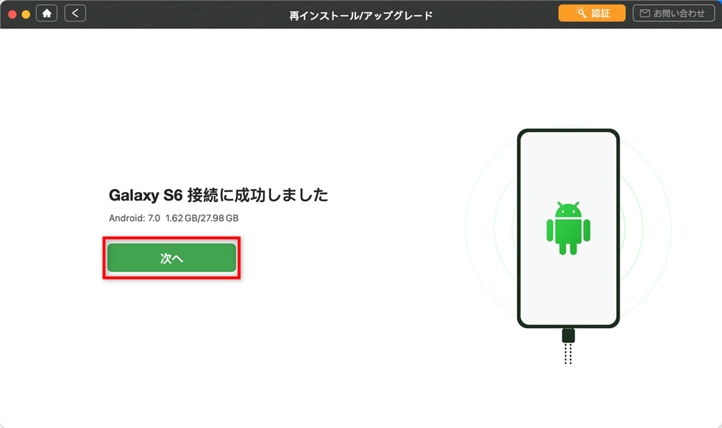 Step 3: バージョンを更新したいスマホをパソコンに接続します。DroidKitに認識されたら、「次へ」をクリックします。