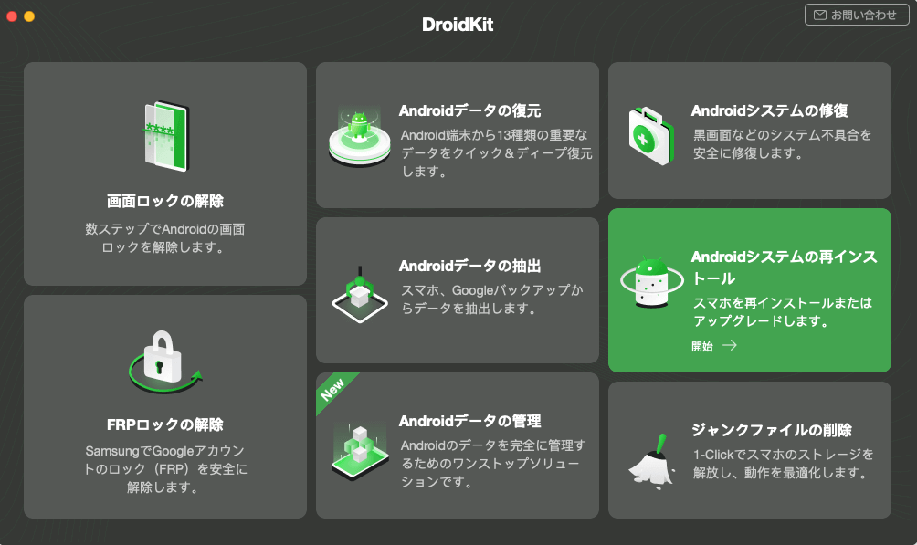 Step 1: DroidKitを起動して「Androidシステムの再インストール」を選択してください。