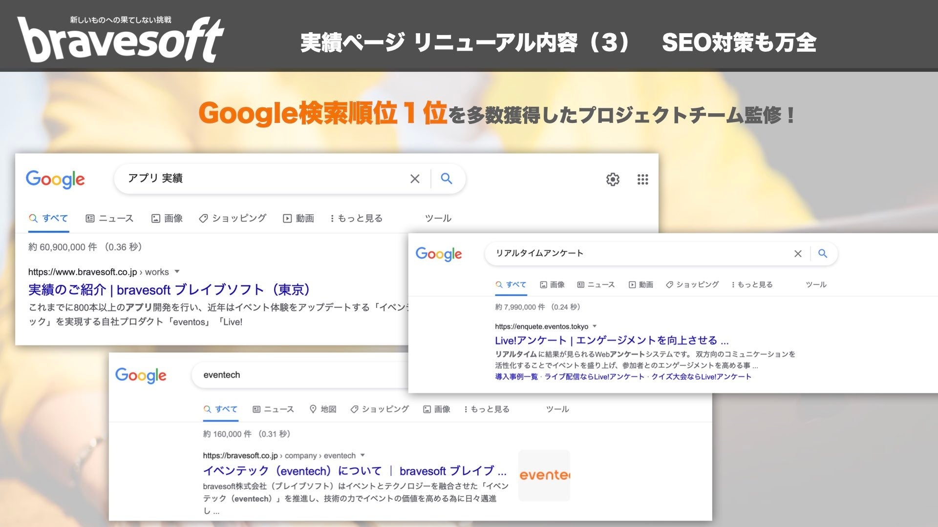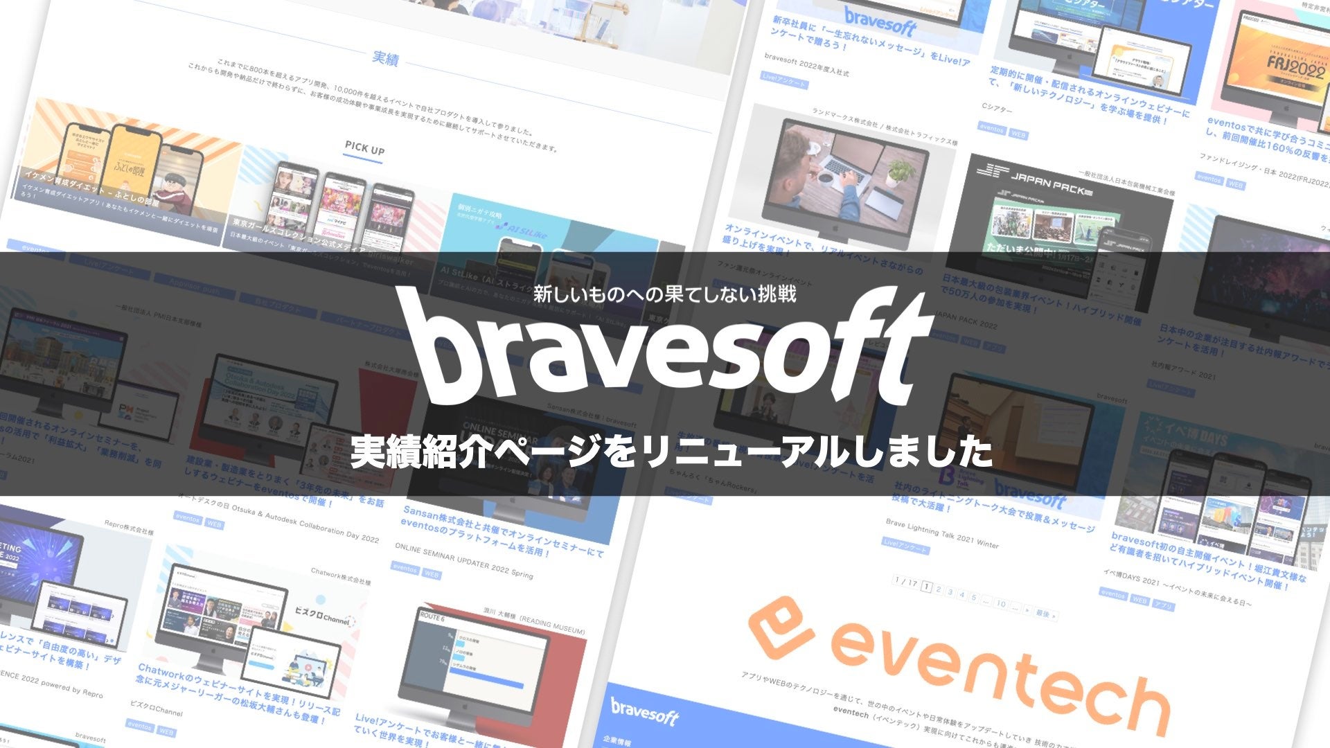 これまではアプリ開発実績に主軸を置いた実績紹介を行なっておりましたが、近年におけるWEBの開発実績の増加や、イベンテック事業(eventos、Live!アンケート)における導入実績なども紹介し、bravesoftとしてクライアントのイベント成功や事業成長を実現できた事例を全て紹介するべくリニューアルを行なっております。