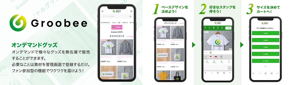 Groobeeはオンデマンド機能を搭載することでECサイトを開設したECオーナーやサイトを利用するファンは数百種類からベースとなるアイテムを選択し、ECオーナーが用意したスタンプを自在に動かし配置することで、好きなデザインのグッズ製造ができます。オンライン上で制作したオリジナルグッズは、即日製造が可能で、製作・注文から最短で翌日に出荷できます。在庫リスクを0でグッズの販売ができるため、ECオーナー側がスタンプとなる素材を変更するだけで新商品の展開が可能になります。